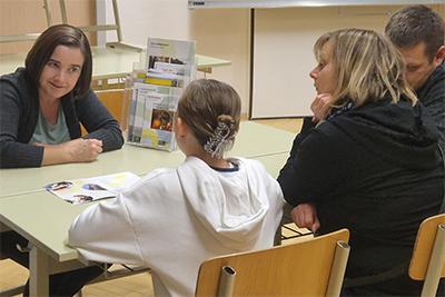 Nach der Präsentation im Plenum bestand noch die Möglichkeit sich bei den einzelnen Schulen in einem Gespräch genauer zu informieren. Es hat uns sehr gefreut, dass eine ehemalige Schülerin (Melissa Rupp) mit ihrem Lehrer mitgekommen ist, um aus dem Schulalltag zu erzählen. | |